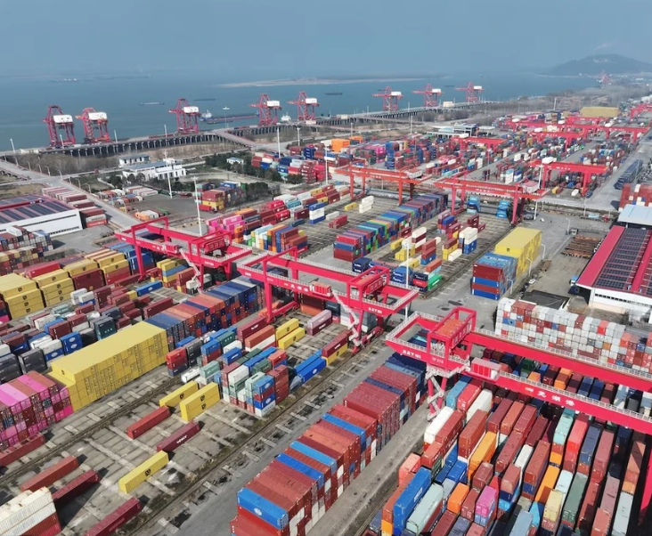 Các container và tàu chở hàng tại một cảng ở Wuhu, tỉnh An Huy (Trung Quốc). Ảnh: Reuters.