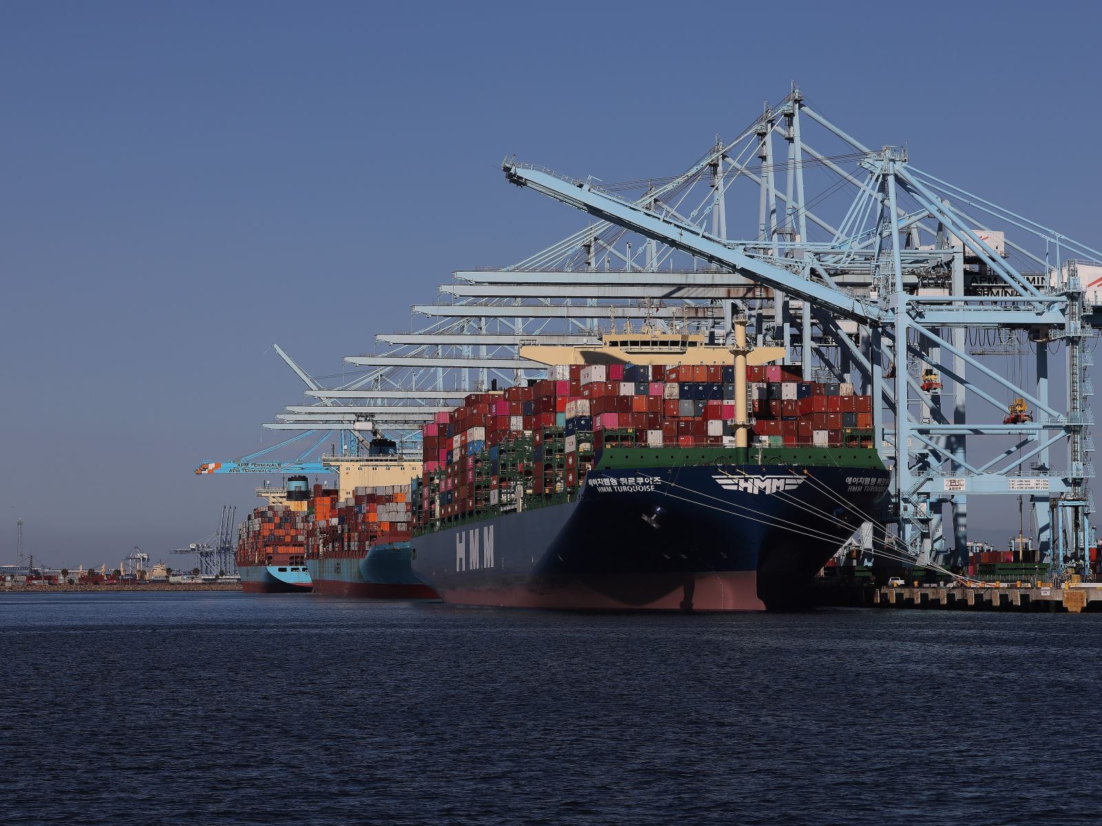 Tàu chở hàng hóa neo tại cảng Los Angeles, California, Mỹ. Ảnh: THX/TTXVN