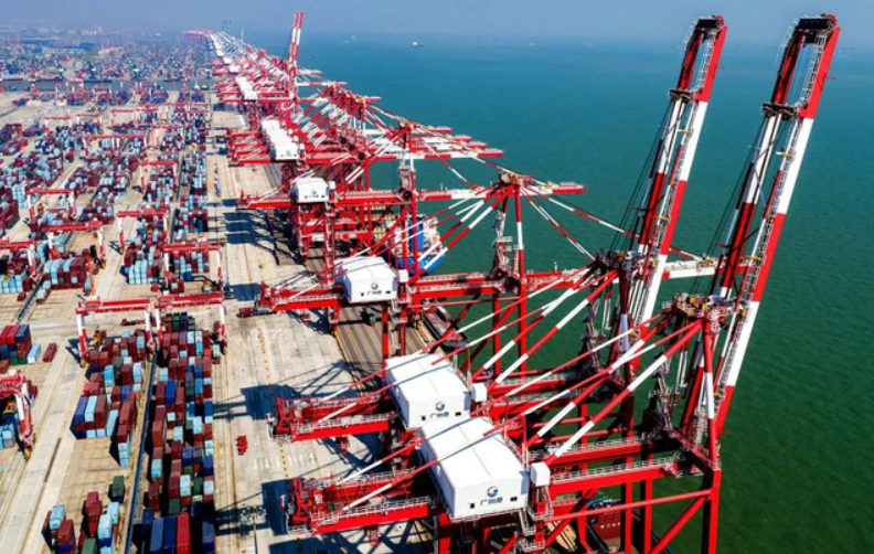 Hàng hóa xuất nhập khẩu được chứa trong các container tại cảng Nam Sa, TP Quảng Châu, tỉnh Quảng Đông - Trung Quốc - Ảnh: TÂN HOA XÃ