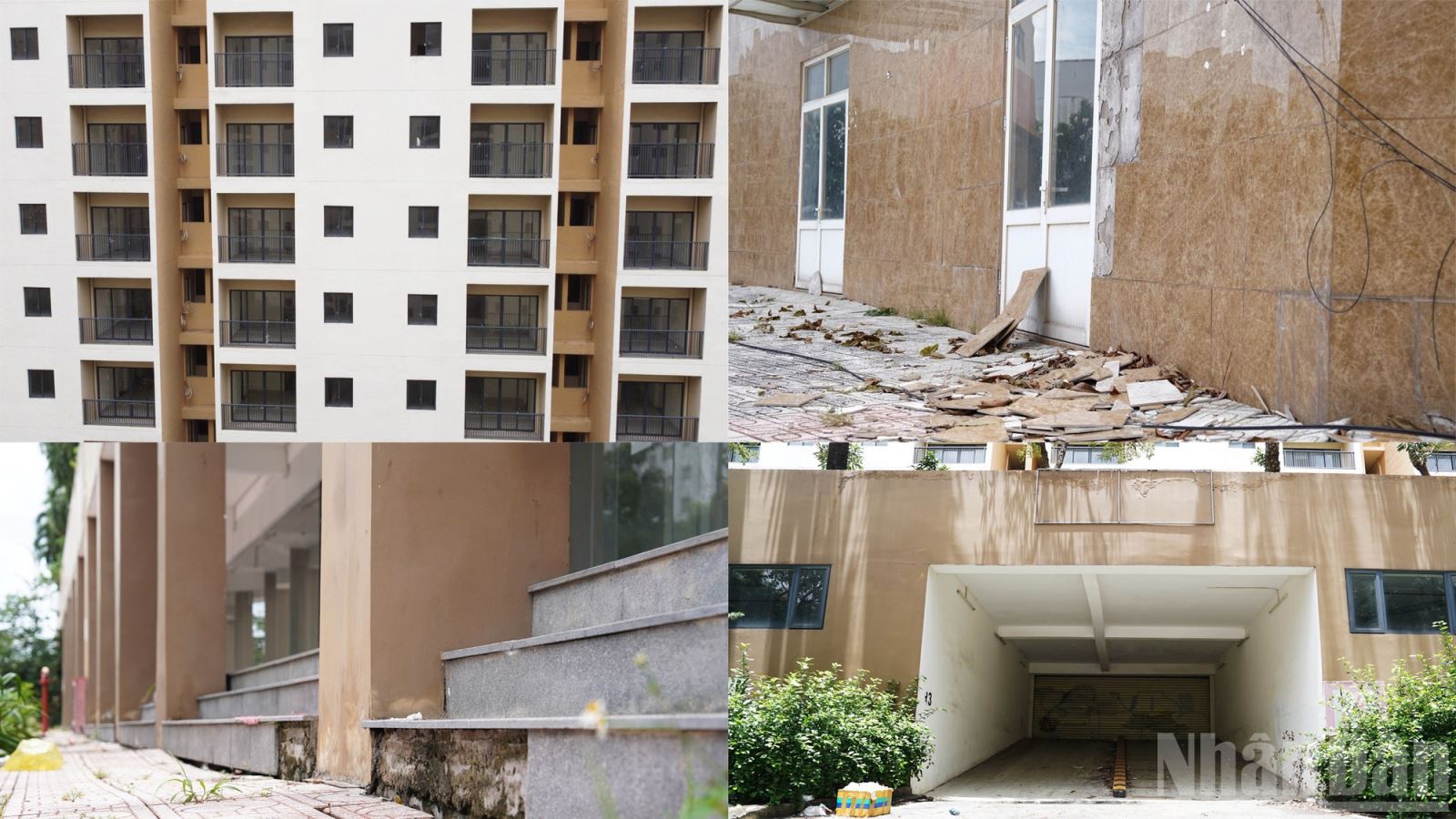 Nhiều hạng mục trong khu tái định cư này đã xuống cấp sau nhiều năm bỏ trống. Gạch ốp tường bong tróc, sơn tường nứt nẻ, loang lổ, làm giảm đáng kể giá trị công trình. (Ảnh Thế Anh - Báo Nhân Dân.