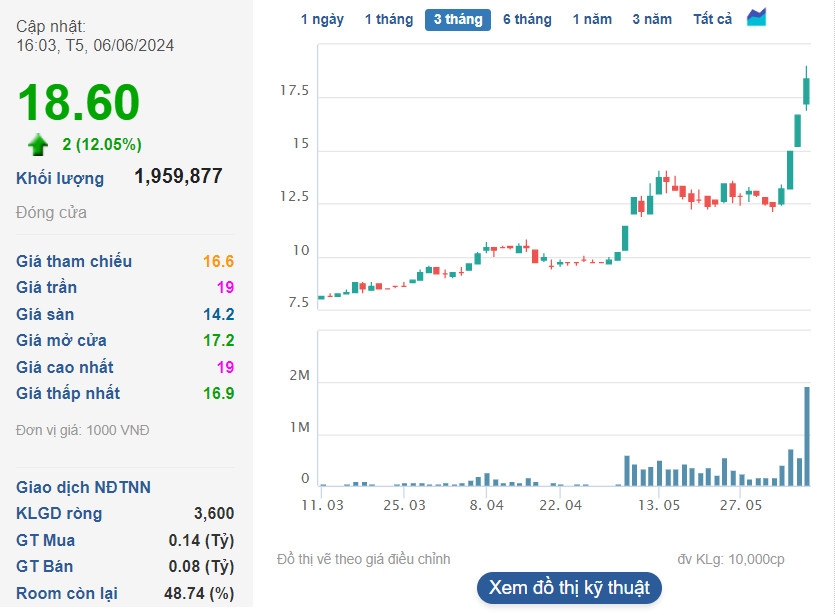 Đóng cửa phiên giao dịch ngày 6/6, cổ phiếu TTN của Công ty CP Công nghệ và Truyền thông Việt Nam (VNTT) tiếp tục có cho mình thêm một phiên tăng mạnh 12,05%, đưa thị giá lên mức 18.600 đồng/cổ phiếu với gần 2 triệu cổ phiếu sang tay. Trước đó, TTN cũng đã có 3 phiên liên tiếp tăng mạnh, trong đó có tới 2 phiên tăng kịch trần.