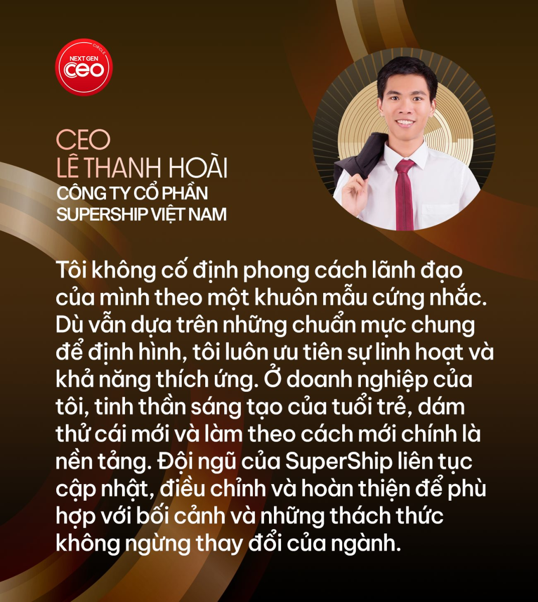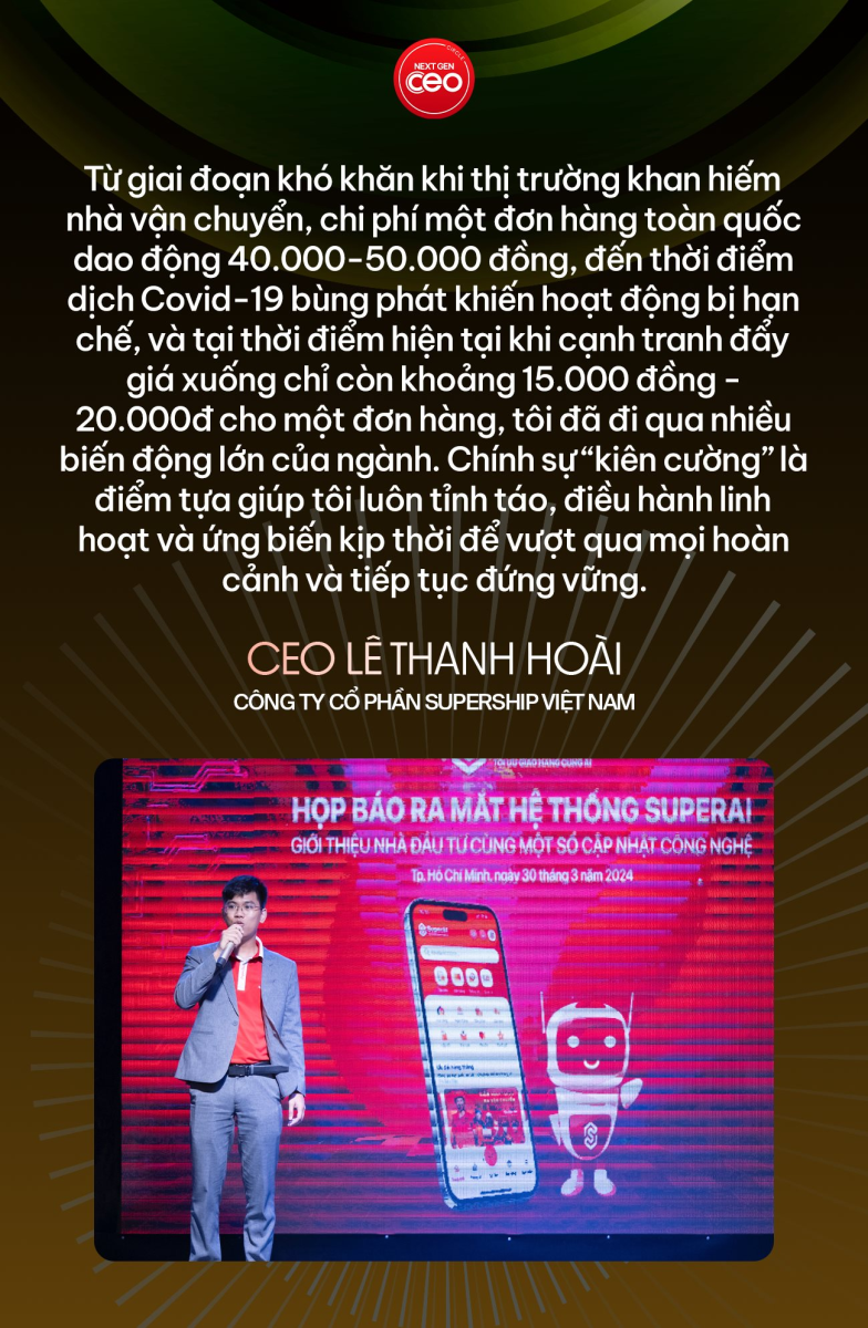 “Từ giai đoạn khó khăn khi thị trường khan hiếm nhà vận chuyển, chi phí một đơn hàng toàn quốc dao động 40.000–50.000 đồng, đến thời điểm dịch Covid-19 bùng phát khiến hoạt động bị hạn chế, và tại thời điểm hiện tại khi cạnh tranh đẩy giá xuống chỉ còn khoảng 15.000 đồng - 20.000đ cho một đơn hàng — tôi đã đi qua nhiều biến động lớn của ngành. Chính sự “kiên cường” là điểm tựa giúp tôi luôn tỉnh táo, điều hành linh hoạt và ứng biến kịp thời để vượt qua mọi hoàn cảnh và tiếp tục đứng vững”, CEO Lê Thanh Hoài khẳng định.