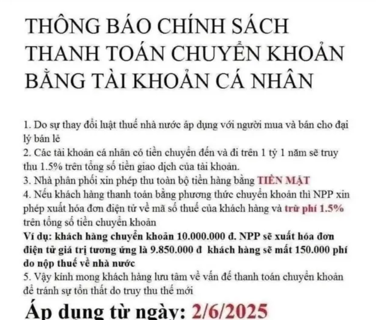 Thông báo giao dịch bằng tiền mặt, nếu chuyển khoản thu thêm 1,5% thuế từ ngày 2/6.