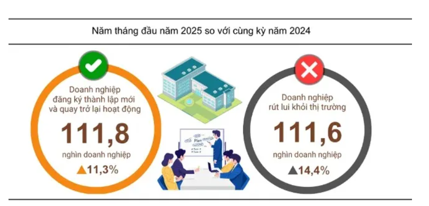 Tính chung năm tháng đầu năm 2025, 111,8 nghìn doanh nghiệp thành lập mới, quay lại hoạt động. Trong khi đó, 111,6 nghìn doanh nghiệp rút lui khỏi thị trường. Tỷ lệ này xấp xỉ mức 1-1, có nghĩa, cứ 1 doanh nghiệp mới gia nhập, thì 1 doanh nghiệp lại rút khỏi thị trường.