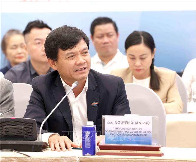 Ông Nguyễn Xuân Phú, Phó Chủ tịch Hiệp hội Doanh nghiệp Nhỏ và Vừa Hà Nội, Chủ tịch Tập đoàn Sunhouse phát biểu tại diễn đàn. Ảnh: Phương Hoa/TTXVN