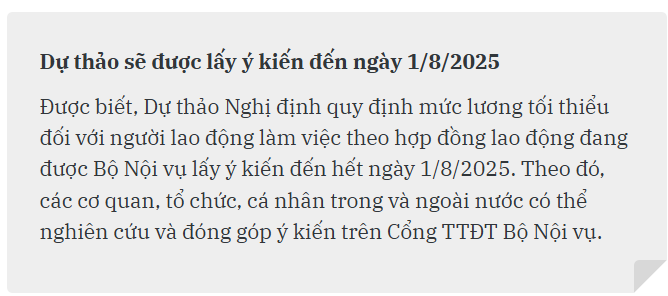 Bộ Nội vụ đang lấy ý kiến dự thảo Nghị định quy định mức lương tối thiểu đối với người lao động làm việc theo hợp đồng lao động. Nghị định dự kiến có hiệu lực thi hành kể từ ngày 1/1/2026.
