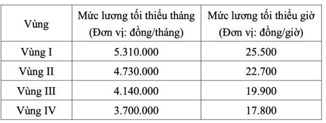Quy định các mức lương tối thiểu giờ theo 4 vùng: vùng I là 25.500 đồng/giờ, vùng II là 22.700 đồng/giờ, vùng III là 20.000 đồng/giờ, vùng IV là 17.800 đồng/giờ.