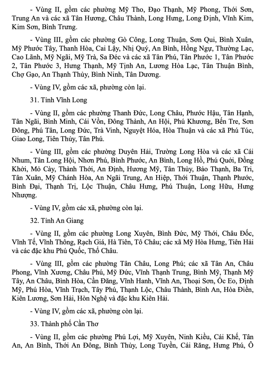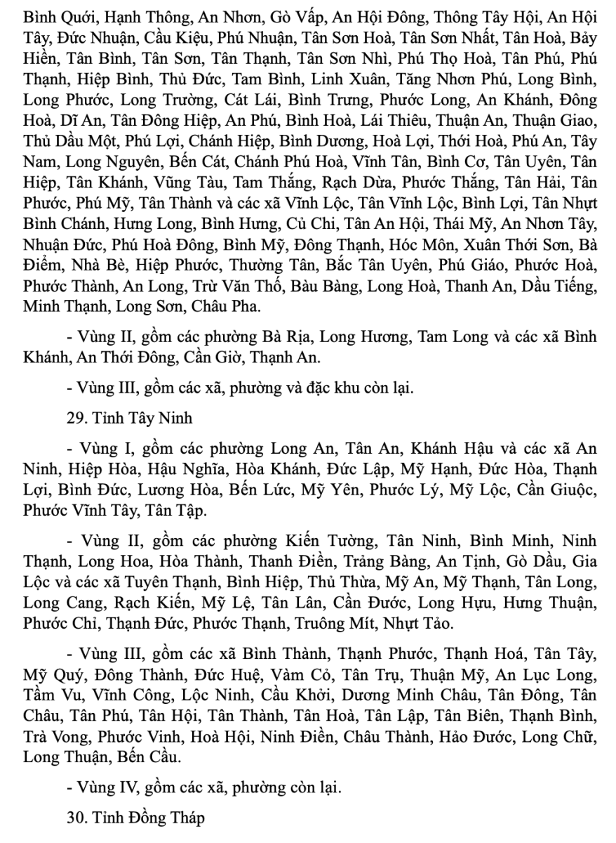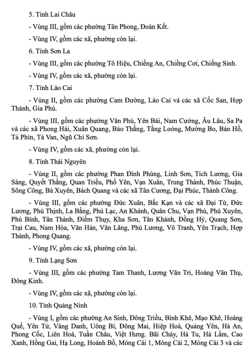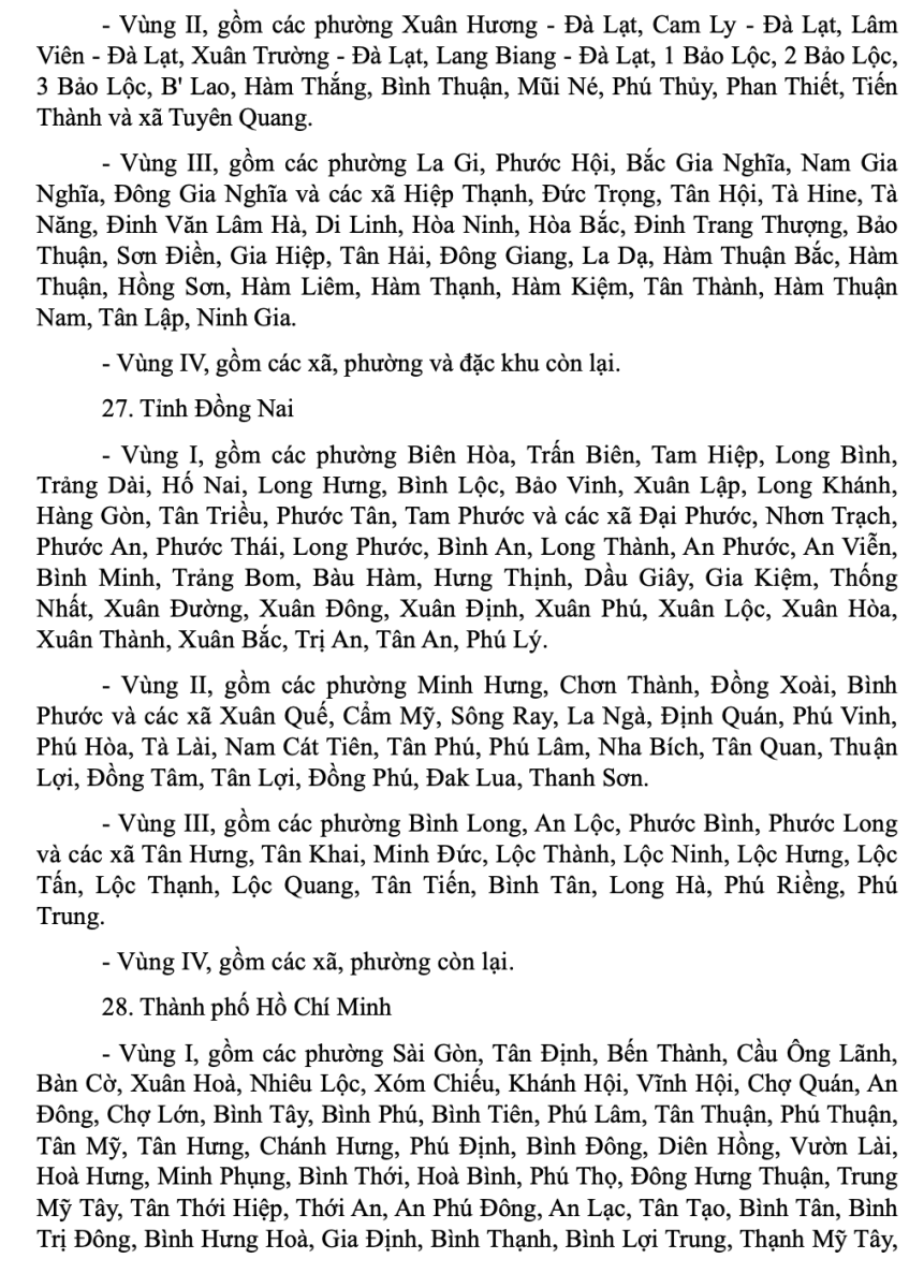 Danh mục địa bàn vùng I, vùng II, vùng III, vùng IV áp dụng lương tối thiểu vùng