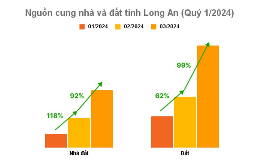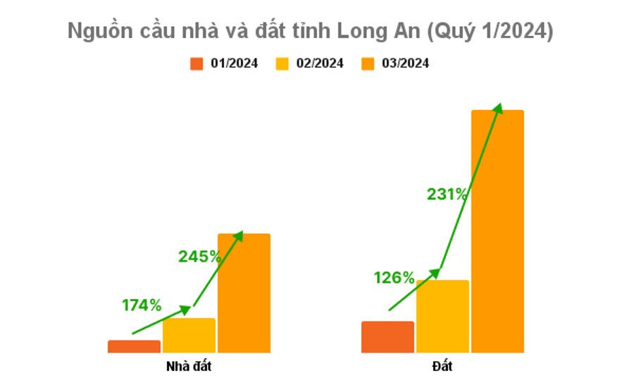Đến đầu năm 2024, bất động sản nơi đây lại âm thầm “gợn sóng". Nguồn cung bất động sản có dấu hiệu tăng lên. Báo cáo mới nhất từ Nhà Tốt chỉ ra, nguồn cung mới nhà đất trong quý 1/2024 tại Long An đều tăng trưởng đáng kể qua từng tháng. Cụ thể, trong tháng 3 nguồn cung tăng gấp 3 lần so với tháng 1; trong đó, phân khúc đất nền tăng trưởng đến 2 lần trong cùng giai đoạn. Tương tự như xu thế tăng trưởng của nguồn cung, nhu cầu mua và quan tâm nhà đất tại tỉnh Long An cũng ghi nhận sự tăng trưởng đáng kể. So với nguồn cầu tháng 1/2024, số lượng xem tin nhà tại tỉnh Long An tăng gấp 8 lần, trong khi số lượng xem tin đất tăng gấp 4 lần trong tháng 3/2024.