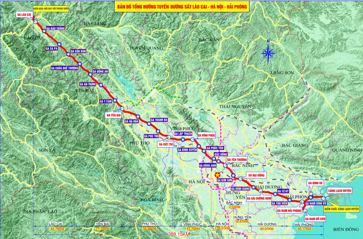 Tuyến đường sắt sẽ đi qua 9 tỉnh, thành: Lào Cai, Yên Bái, Phú Thọ, Vĩnh Phúc, Hà Nội, Bắc Ninh, Hưng Yên, Hải Dương và Hải Phòng với tổng chiều dài chính tuyến 388,1km.