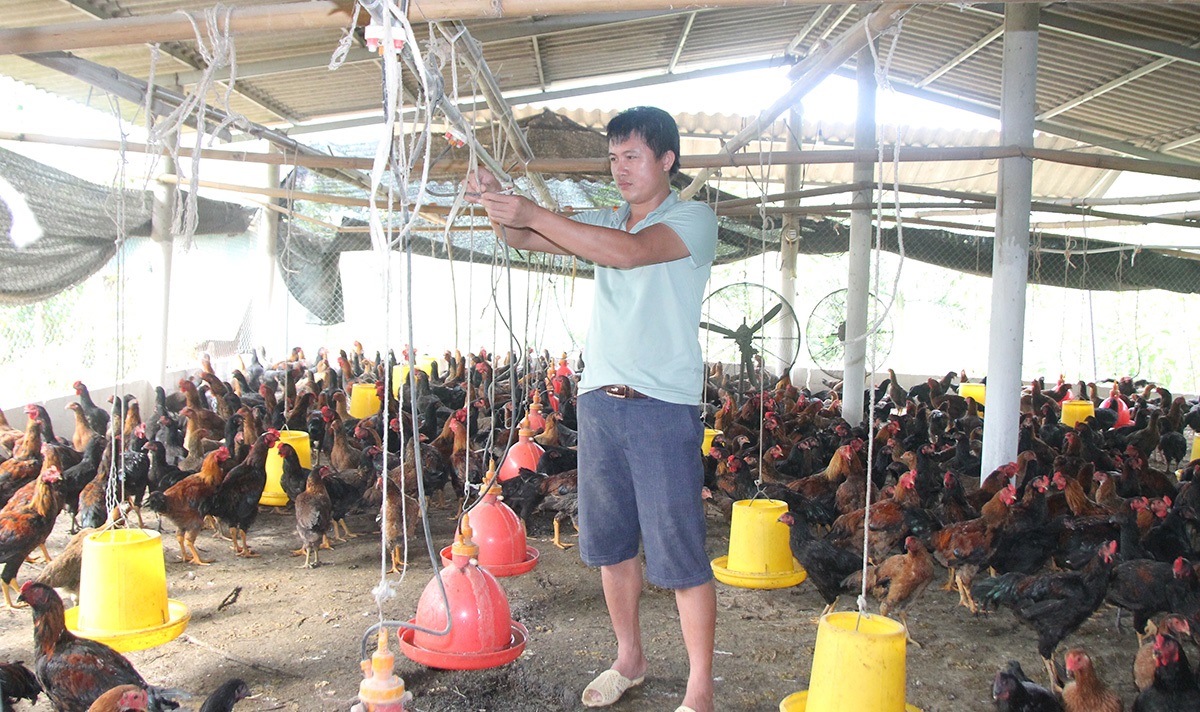 Anh Phạm Văn Hợi, Giám đốc HTX chăn nuôi gia cầm Hợp Thành (Sơn Dương) chăm sóc đàn gà.