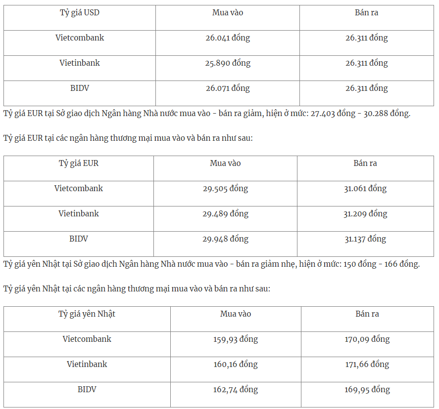 Tỷ giá USD tại các ngân hàng thương mại mua vào và bán ra như sau: