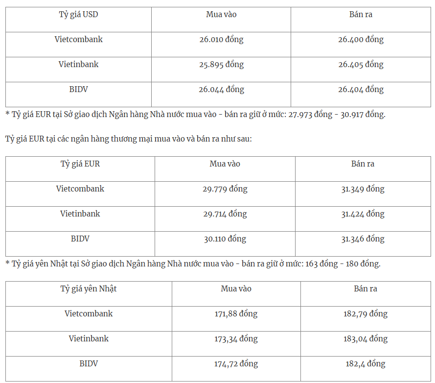 Tỷ giá USD tại các ngân hàng thương mại mua vào và bán ra như sau: