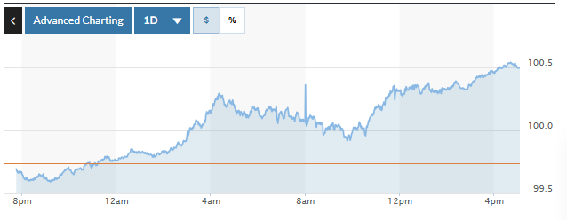 Biểu đồ biến động Chỉ số DXY trong 24 giờ qua. Ảnh: Market watch