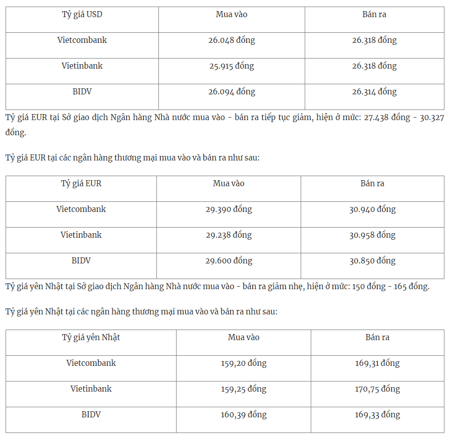 Tỷ giá USD tại các ngân hàng thương mại mua vào và bán ra như sau: