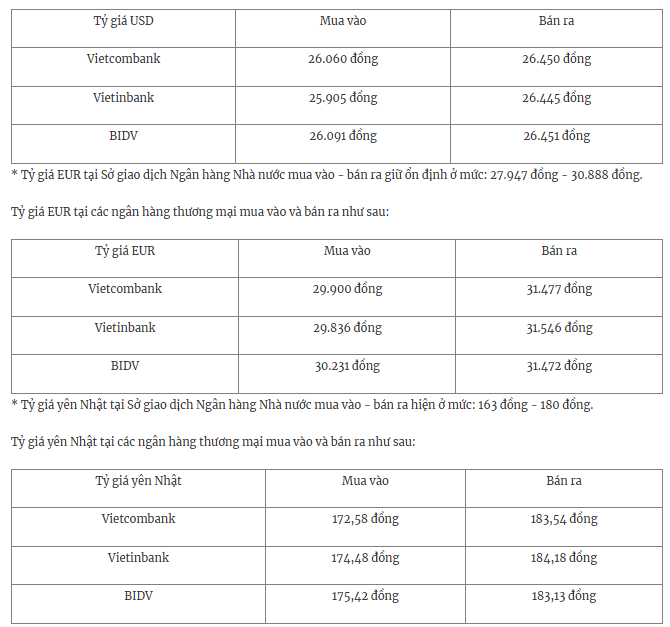 Tỷ giá USD tại các ngân hàng thương mại mua vào và bán ra như sau: