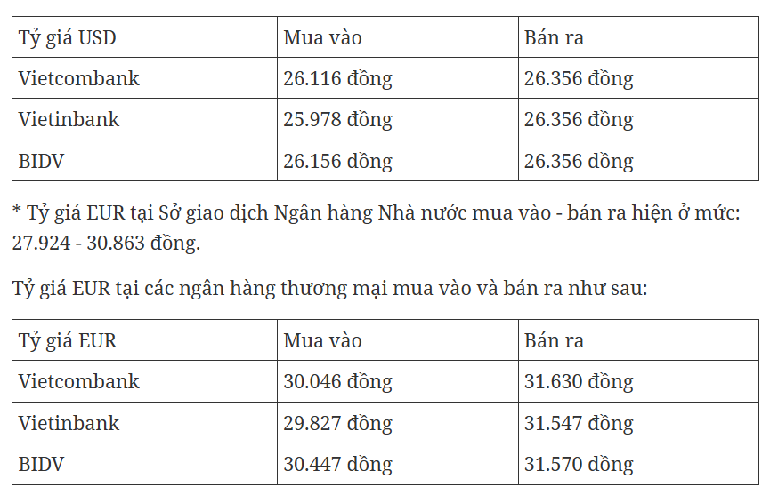 * Tỷ giá tham khảo tại Sở giao dịch NHNN mua vào - bán ra hiện ở mức: 23.896 VND/USD - 26.306 VND/USD.