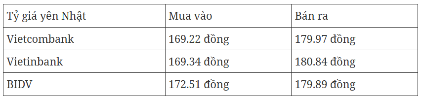 Tỷ giá Yên Nhật tại các ngân hàng thương mại mua vào và bán ra như sau: