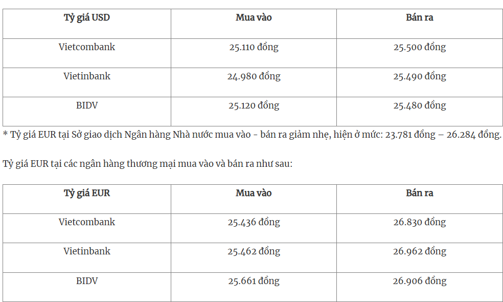 Tỷ giá USD tại các ngân hàng thương mại mua vào và bán ra như sau: