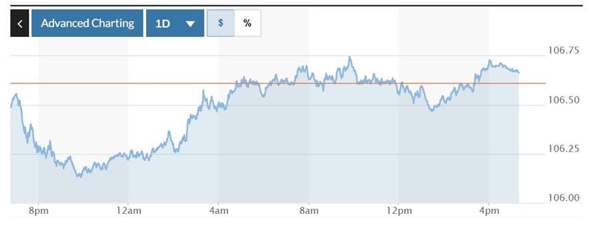 Biểu đồ biến động Chỉ số DXY trong 24 giờ qua. Ảnh: Marketwatch