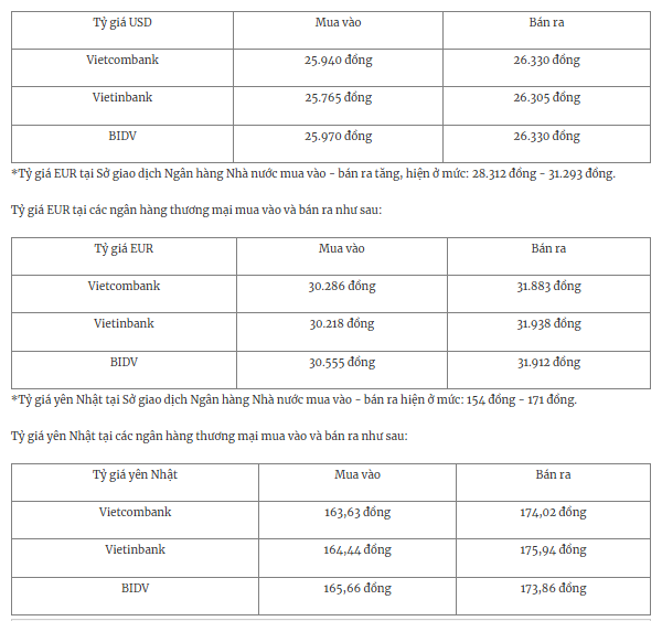 Tỷ giá USD tại các ngân hàng thương mại mua vào và bán ra như sau: