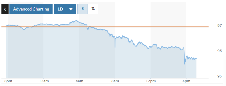 Biểu đồ biến động Chỉ số DXY trong 24 giờ qua. Ảnh: Market watch