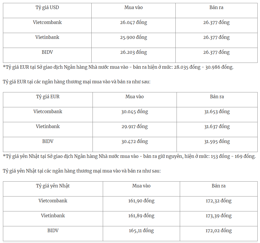 Tỷ giá USD tại các ngân hàng thương mại mua vào và bán ra như sau: