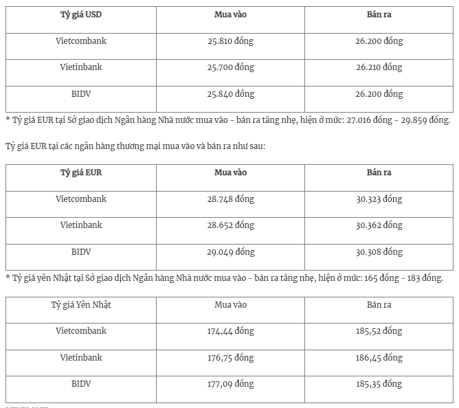 Tỷ giá USD tại các ngân hàng thương mại mua vào và bán ra như sau: