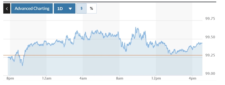 Biểu đồ biến động Chỉ số DXY trong 24 giờ qua. Ảnh: Marketwatch