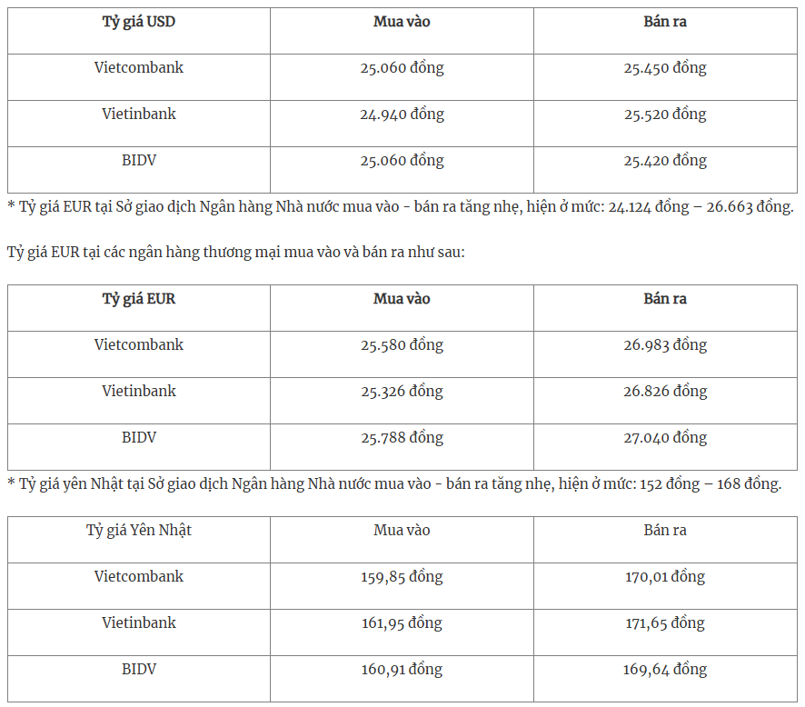 Tỷ giá USD tại các ngân hàng thương mại mua vào và bán ra như sau: