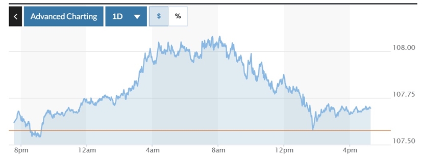Biểu đồ biến động Chỉ số DXY trong 24 giờ qua. Ảnh: Marketwatch