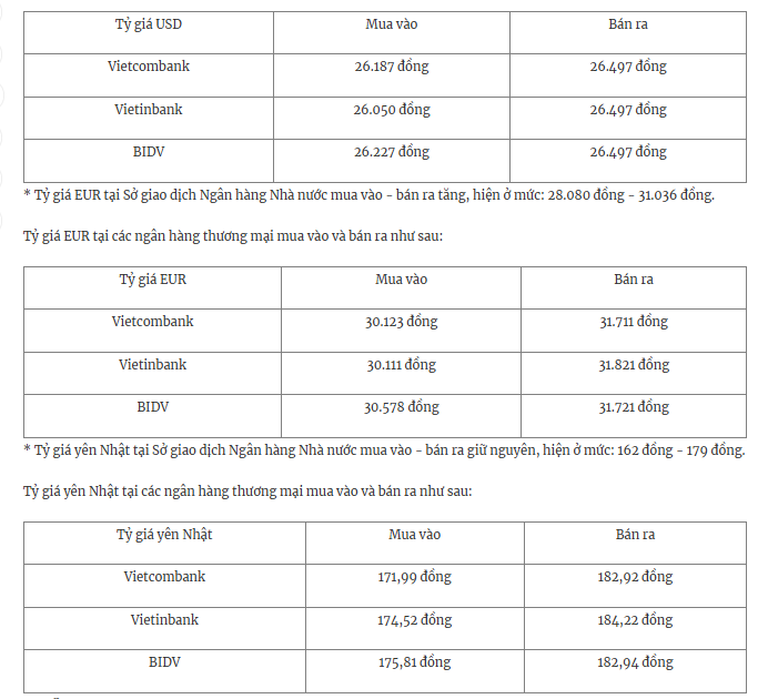 Tỷ giá USD tại các ngân hàng thương mại mua vào và bán ra như sau: