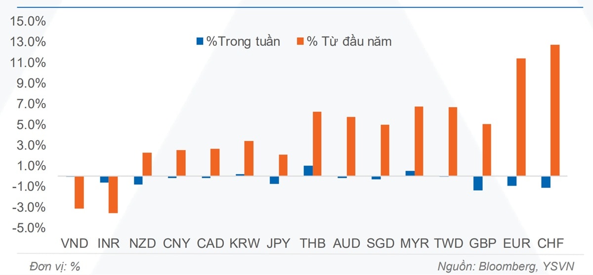 Tỷ giá USD/VND chính thức trong nước giảm nhẹ so với tuần trước đó, bất chấp đồng USD quốc tế phục hồi. Trong khi tỷ giá trung tâm duy trì quanh mức 25.093 VND/USD và tỷ giá bán ra tại NHTM ở quanh 26.345–26.351 VND/USD, đều giảm 0,02% WoW. Tỷ giá thị trường tự do chững lại đà tăng (+0,4% WoW) nhưng vẫn cao hơn nhiều so với tỷ giá tại NH, kết tuần ở mức 27.760 VND/USD, chênh lệch khoảng +1.400 VND/USD so với tỷ giá tại NHTM, dữ liệu báo cáo tiền tệ tuần cuối tháng Mười của YSVN ghi nhận.