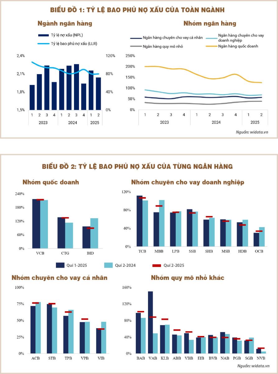 Nhóm ngân hàng quy mô nhỏ lại cho thấy những diễn biến tích cực ở phần lớn các ngân hàng khi các ngân hàng đều chủ động gia tăng bộ đệm dự phòng trong năm 2025. BAB là một ví dụ nổi bật với mức tăng đột biến từ 86,1% (quí 2-2024) lên 101,1% (quí 2-2025), phản ánh sự tích cực trong việc xử lý nợ xấu và củng cố bộ đệm. Ngân hàng có tỷ lệ LLR thấp nhất nhóm là NVB cũng đã tăng mạnh bộ đệm trong quí 2, nhờ vào việc đẩy mạnh trích lập dự phòng (tăng 114,54%) và đồng thời xử lý nợ xấu một cách hiệu quả (quy mô nợ xấu giảm 56,48%). Tuy nhiên, không phải tất cả đều thuận lợi. NAB chứng kiến sự sụt giảm mạnh nhất trong nhóm, từ 47,2% (quí 2-2024) xuống 39% (quí 2-2025). Mức giảm này phản ánh những khó khăn mà NAB đang phải đối mặt, khi tỷ lệ nợ xấu tại cuối quí 2 đã tăng lên 2,85% so với 2,57% của cùng kỳ.