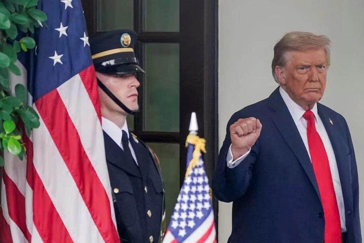 Tổng thống Mỹ Donald Trump ra hiệu trong cuộc đàm phán nhằm chấm dứt chiến tranh giữa Nga - Ukraine, tại Washington D.C, ngày 18/8/2025. Ảnh: Reuters.