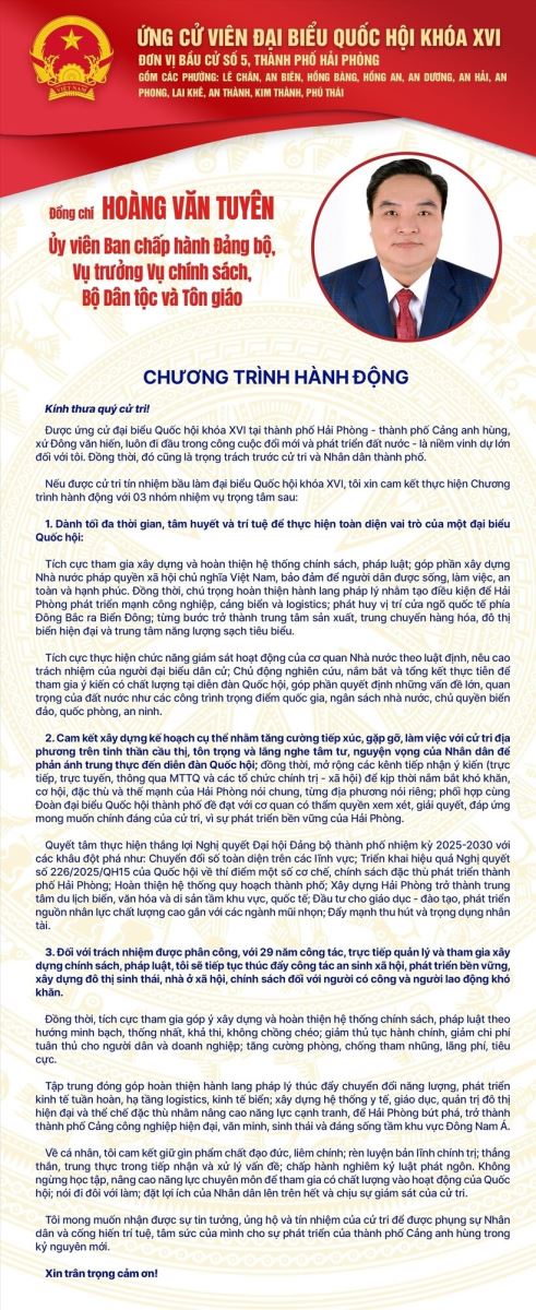 Với 29 năm kinh nghiệm trong lĩnh vực hoạch định chính sách, ông Hoàng Văn Tuyên, Vụ trưởng Vụ Chính sách, Bộ Dân tộc và Tôn giáo cam kết sẽ dành tâm huyết để hoàn thiện hành lang pháp lý, giúp Hải Phòng phát huy tối đa lợi thế cửa ngõ quốc tế và trở thành trung tâm năng lượng sạch tiêu biểu của khu vực.
