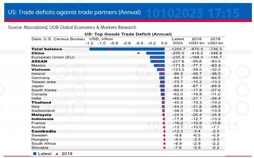 Thâm hụt thương mại hàng hóa của Hoa Kỳ với các đối tác (hàng năm). Nguồn: Ngân hàng UOB.
