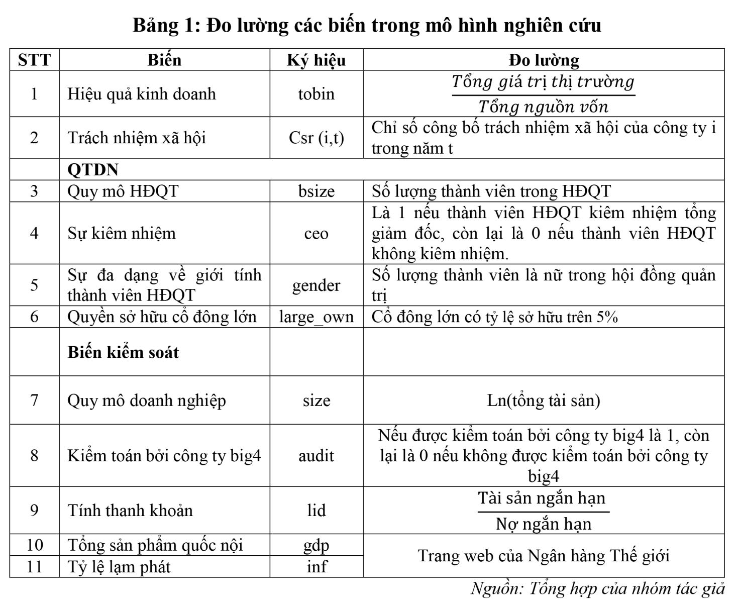 Dựa trên các nghiên cứu thực nghiệm trước đây, các biến kiểm soát được áp dụng trong nghiên cứu bao gồm: Quy mô doanh nghiệp, Tính thanh khoản, Loại hình công ty kiểm toán, Tổng sản phẩm quốc nội và Tỷ lệ lạm phát có tác động tích cực đến hiệu quả hoạt động doanh nghiệp (Cho và cộng sự, 2019; Gulzar và cộng sự, 2019…).