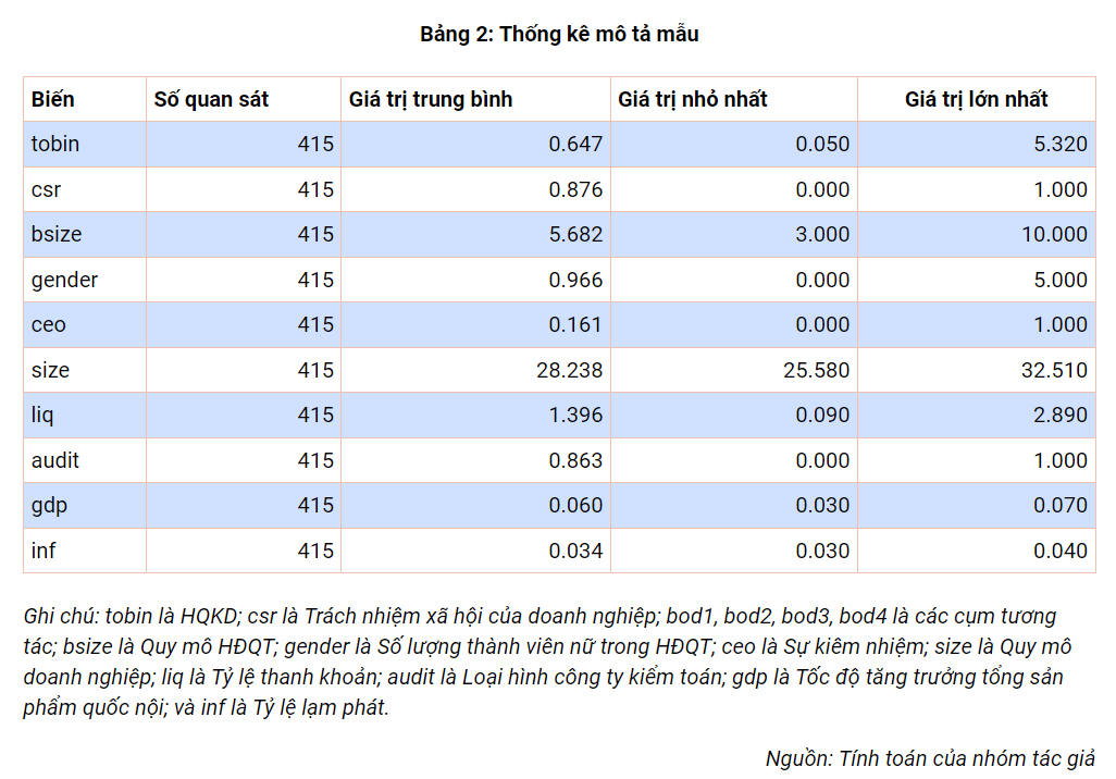 Bảng 2 thể hiện thống kê mô tả mẫu nghiên cứu với số lượng mẫu 415. Yếu tố HQKD được đo lường thông qua chỉ tiêu Tobin’Q. Giá trị lớn nhất là 5.32 và giá trị nhỏ nhất là 0.050. Yếu tố CSR căn cứ vào tiêu chuẩn của GRI và chú trọng đến khía cạnh môi trường, người lao động và cộng đồng địa phương. Những doanh nghiệp có chỉ số CSR cao là 1 là những doanh nghiệp có báo cáo phát triển bền vững, như: VNM, FMC, EVE, PAN, PNJ…, đối với những doanh nghiệp có chỉ số CSR thấp 0 thông thường sẽ rơi vào các doanh nghiệp DCL, FIT, GIL... do có những năm chưa chú trọng đến việc công bố thông tin, nên các nội dung trong báo cáo chưa đáp ứng được các tiêu chí đề ra của CSR.