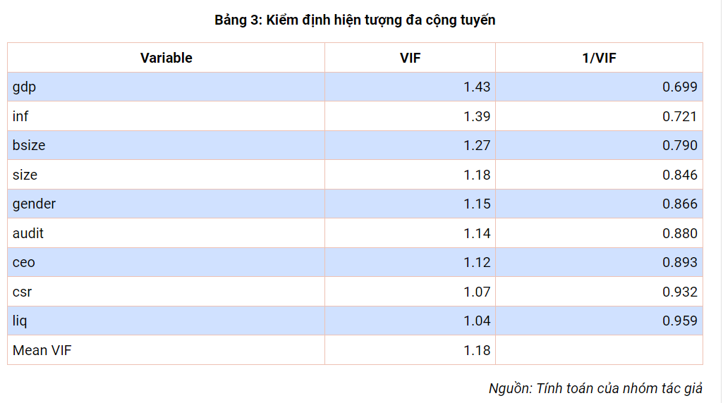 Bảng 3 thể hiện kết quả kiểm định hiện tượng đa cộng tuyến trong mô hình nghiên cứu. Hiện tượng đa cộng tuyến xảy ra khi 2 hoặc nhiều yếu tố dự báo trong mô hình có mối tương quan với nhau. Hiện tượng đa cộng tuyến được đo lường bằng các yếu tố lạm phát phương sai (VIF). Trong nghiên cứu này, VIF < 4.0, do đó trong mô hình, các ước lượng của hệ số hồi quy là đáng tin cậy và ổn định. Điều đó dẫn đến kết quả không tồn tại hiện tượng đa cộng tuyến trong mô hình (Hair và cộng sự, 1985).