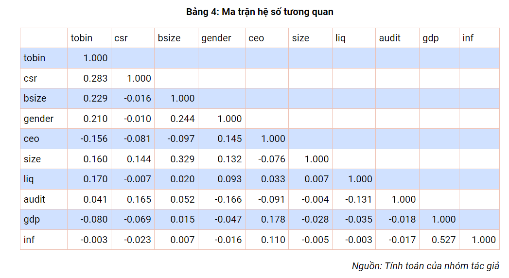 Đối với các biến kiểm soát, Quy mô doanh nghiệp với giá trị giao động từ 25.580 đến 32.510, có giá trị trung bình 28.238. Bên cạnh đó, tỷ lệ thanh khoản với giá trị nhỏ nhất là 0.090 và giá trị lớn nhất là 2.890, giá trị trung bình 1.396, điều này cho thấy các doanh nghiệp sản xuất niêm yết đảm bảo tỷ lệ thanh khoản tốt, có khả năng đảm bảo các khoản nợ đáo hạn trong năm. Trong các doanh nghiệp sản xuất niêm yết, giá trị trung bình 0.863 đơn vị thể hiện đa phần các doanh nghiệp niêm yết kiểm toán báo cáo tài chính bởi các công ty kiểm toán Big4. Khía cạnh quy mô, thì các biến: Tốc độ tăng trưởng tổng sản phẩm quốc nội và Tỷ lệ lạm phát thì có giá trị trung bình tương ứng là 0.060 và 0.034.