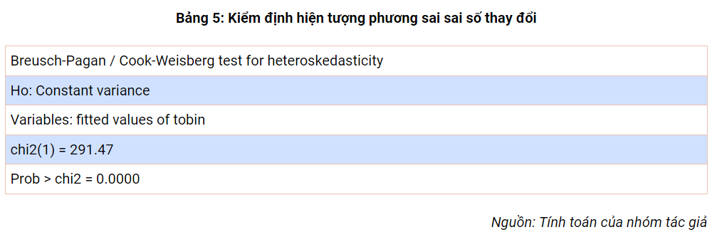 Kết quả kiểm định phương sai sai số thay đổi của mô hình (Bảng 5) cho thấy, giá trị p-values = 0.000 (< 5%), nên giả thuyết H0 bị bác bỏ, vì vậy mô hình có phương sai thay đổi.