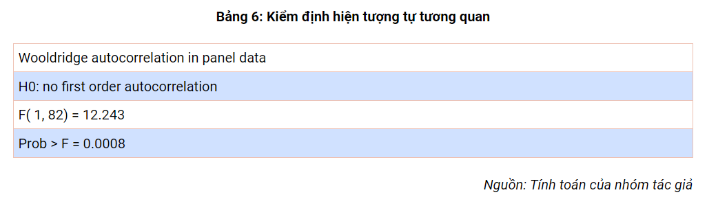 Tương tự với kết quả kiểm định phương sai sai số thay đổi, kết quả kiểm định hiện tượng tự tương quan (Bảng 6) cho thấy, với giá trị P-values = 0.003 (< 5%), nên giả thuyết H0 bị bác bỏ, do đó, hiện tượng tự tương quan tồn tại trong mô hình nghiên cứu. Do mô hình vẫn tồn tại các khuyết tật như hiện tượng phương sai sai số thay đổi, hiện tượng tự tương quan, nên phương pháp FEM, REM được sử dụng để khắc phục các khuyết tật trên.