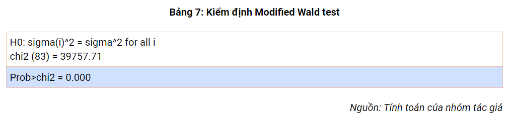Trên cơ sở chọn lựa 3 phương pháp OLS, FEM và REM. Theo đó, mô hình FEM là phù hợp sau các kiểm định. Tuy nhiên, để kết luận mô hình tác động cố định sau cùng có tồn tại hiện tượng phương sai thay đổi, kiểm định Modified Wald test được sử dụng. Kết quả sau đây thể hiện kết quả kiểm định Modified Wald test.