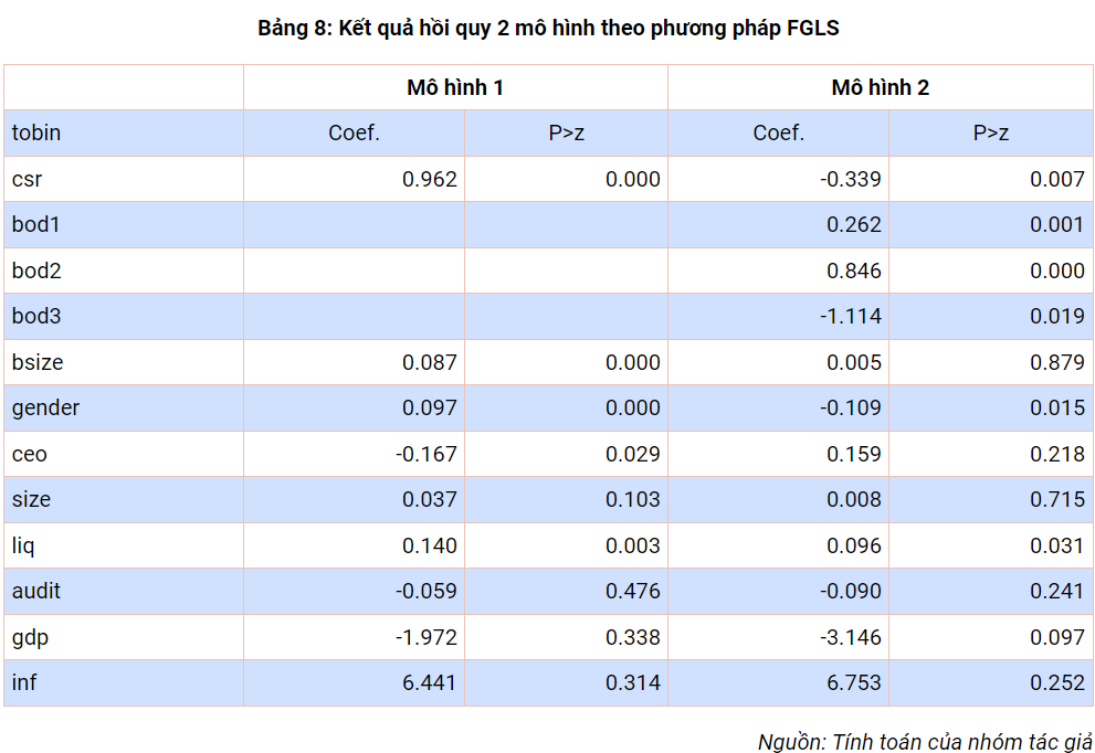 Kết quả kiểm định Modified Wald test (Bảng 7) cho thấy, giá trị p-value trong kiểm định Modified Wald test = 0.000 (< 5%), nên giả thuyết H0 bị bác bỏ. Điều này dẫn đến hiện tượng phương sai vẫn tồn tại trong mô hình FEM và ước lượng bằng phương pháp này bị chệch và không tin cậy. Trên cơ sở đó, nhóm tác giả sử dụng phương pháp bình phương tối thiểu tổng quát khả thi (FGLS) để khắc phục các khuyết tật của mô hình.