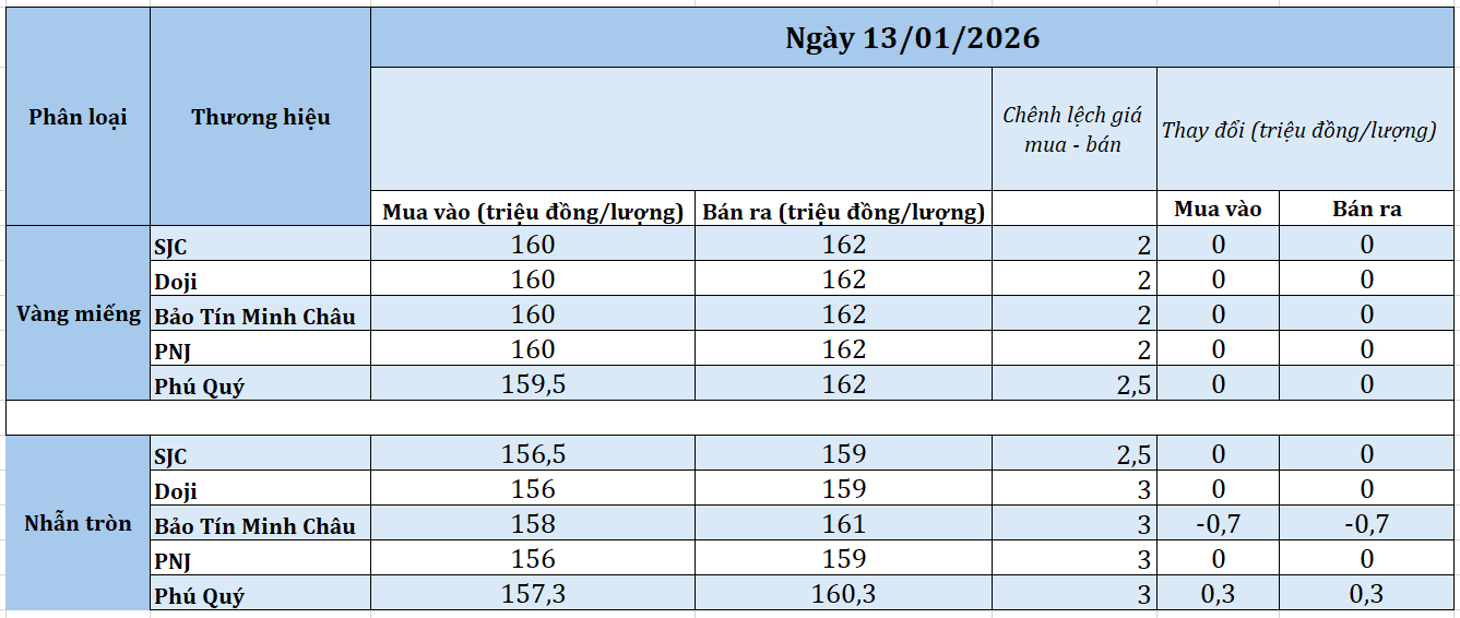 Phiên giao dịch sáng nay (13/1), lúc 10 giờ, giá vàng miếng tại các thương hiệu lớn như SJC, Bảo Tín Minh Châu, DOJI và PNJ đều đi ngang so với giá khảo sát sáng qua. Hiện giá vàng miếng được niêm yết ở mức 160 – 162 triệu đồng/lượng (mua – bán).