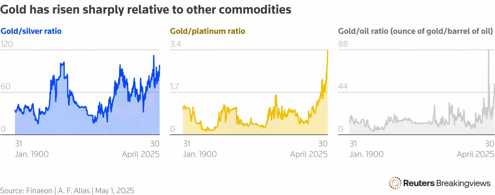 Ngày nay, giá vàng không phù hợp với một số mặt hàng khác. Trong nửa thế kỷ qua, giá trung bình của một ounce vàng cao gấp 21 lần giá của một thùng dầu. Hiện tại, tỷ lệ vàng/dầu là trên 50 lần - mức cao nhất từ trước đến nay ngoại trừ một thời điểm ngắn ngủi vào năm 2020. Vàng cũng có vẻ đắt hơn so với bạc. Kể từ năm 1975, trung bình có thể đổi 60 ounce bạc lấy một ounce vàng. Ngày nay, giá trị của vàng cao hơn khoảng 100 lần so với “người anh em” rẻ hơn này.
