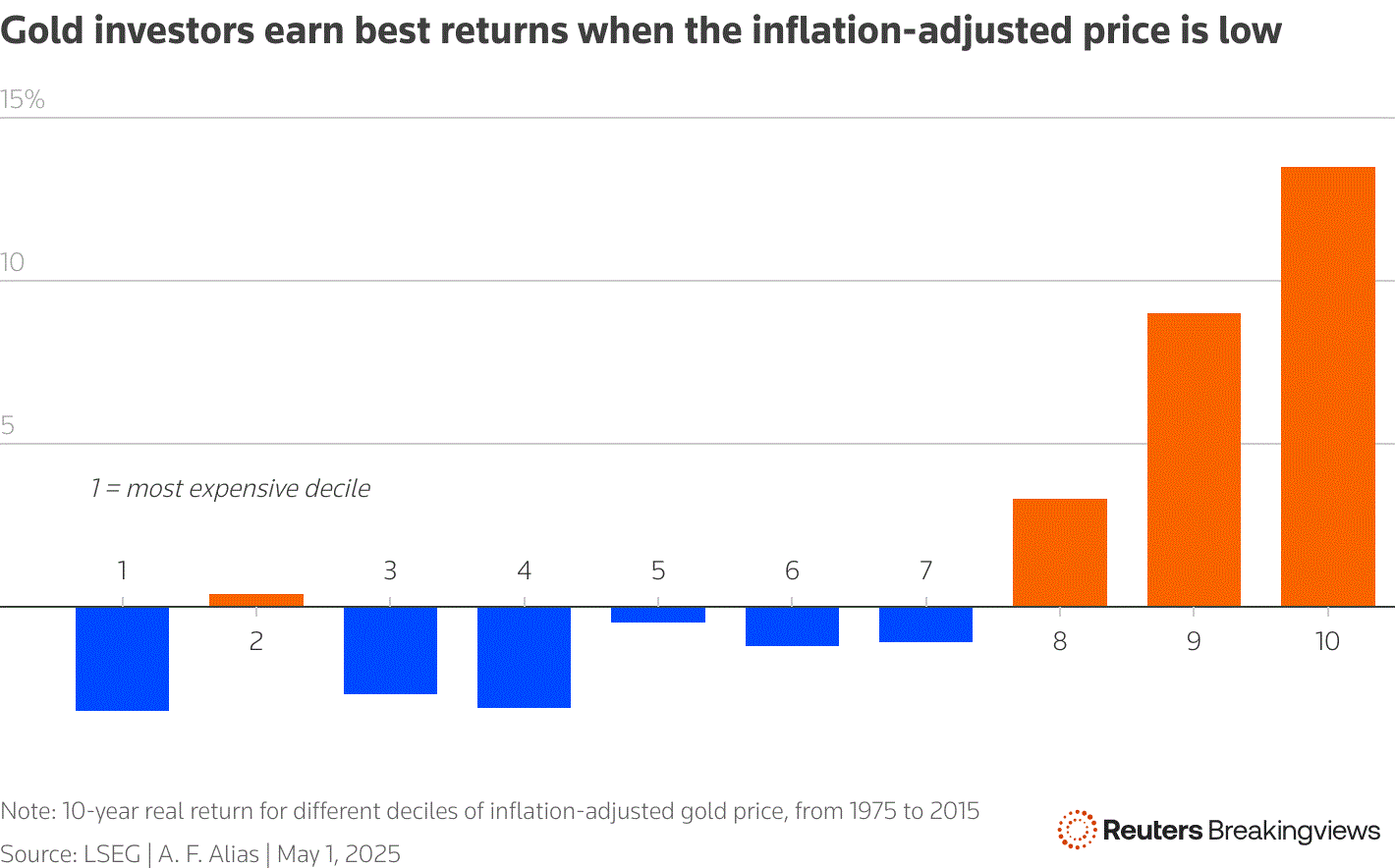 Hồ sơ lịch sử của vàng cho thấy một mô hình tương tự.” Kể từ năm 1975, các nhà đầu tư mua vàng với giá cao đã bị lỗ trong thập kỷ tiếp theo. Ngược lại, mua vàng khi giá tương đối rẻ đã mang lại lợi nhuận (điều chỉnh theo lạm phát) tích cực.
