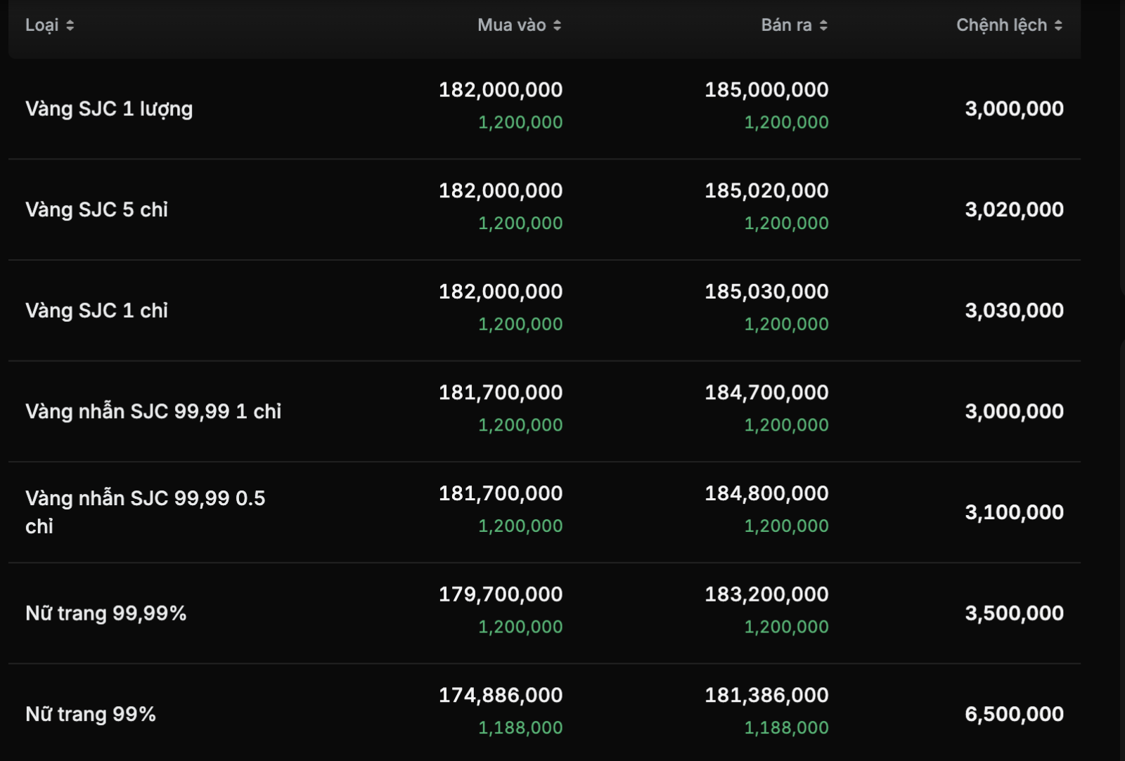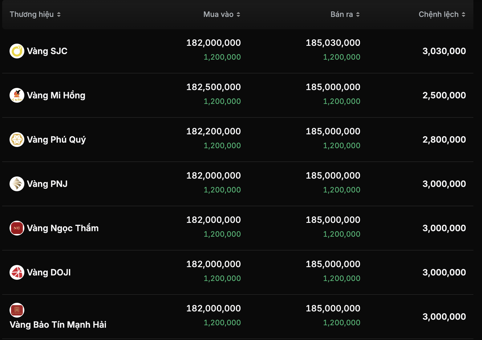 Trong khi đó, các hệ thống PNJ, DOJI, Ngọc Thẩm và Bảo Tín Mạnh Hải cùng niêm yết vàng miếng SJC quanh mức 182 triệu đồng/lượng mua vào và 185 triệu đồng/lượng bán ra, chênh lệch phổ biến khoảng 3 triệu đồng/lượng.