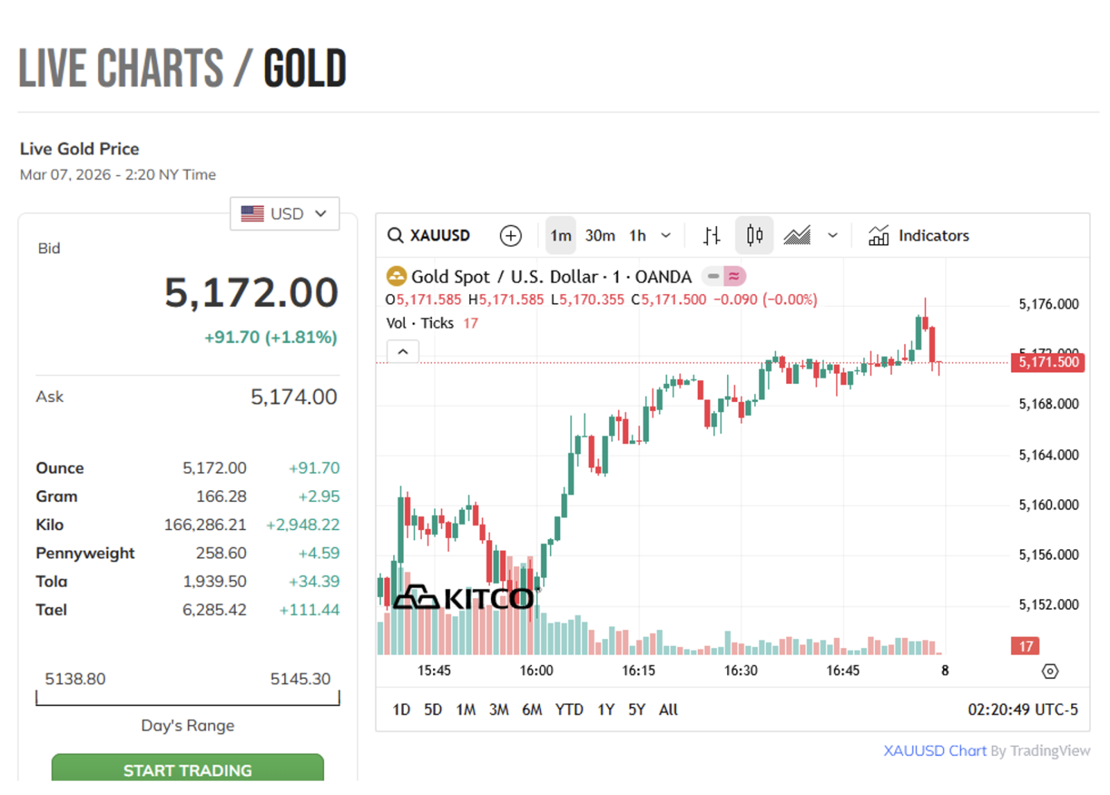 Theo dữ liệu thị trường cập nhật trên trang Kitco, giá vàng giao ngay vào lúc 2 giờ 15 ngày 7/3 (tức 14 giờ 15 ngày 7/3 giờ Việt Nam) tăng tới 1,8%, đạt khoảng 5.174 USD/ounce tại thị trường New York.